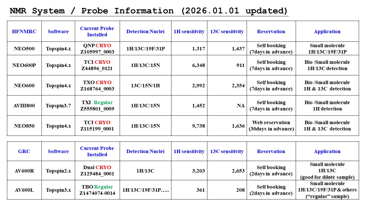 News and Events[ Jan. 27, 2026 ] [ July. 23, 2025 ] [ April. 23, 2025 ] [ Dec. 4, 2024 ] [ May. 21, 2024 ] [ Jun. 13, 2024 ] 高磁場核磁共振中心 High Field Nuclear Magnetic Resonance Center (HFNMRC) 乃於民國91年行政院國家科學委員會「基因體醫學國家型科技計畫之核心設施」的支援下由黃太煌博士設立。民國100年併入國科會生技類核心設施「蛋白質結構分析核心設施」繼續服務。自民國104年5月1日起,納入中研院共用儀器設施,由中央研究院學術儀器處管理。民國108年1月1日至今,則由中央研究院「全院性核心設施及新創儀器計畫」支持。 成立至今陸續設置高磁場核磁共振儀共有六組,並開放全國各界申請使用: